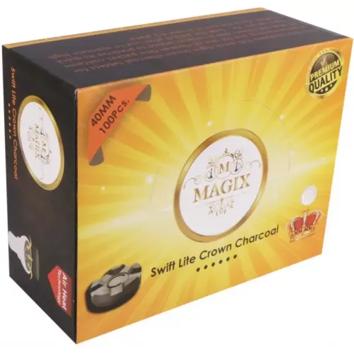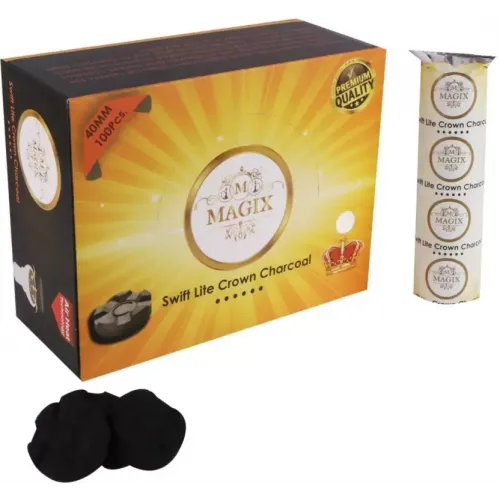 QUICK LIGHT CROWN CHARCOAL TABLES IGNITES IN 3 SECONDS AND BURNS FOR MORE THAN 45 MINUTES. IT'S 40 MM ROUND SHAPED, PERFECTLY CRAFTED FOR LONGER SESSIONS. ONE PACKET HAS 10 CROWN CHARCOAL TABLETS.